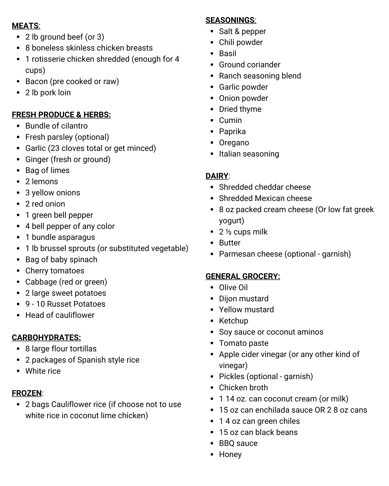- Cauliflower rice if choose not to use white rice in coconut lime chicken (1 bag= 2 servings)